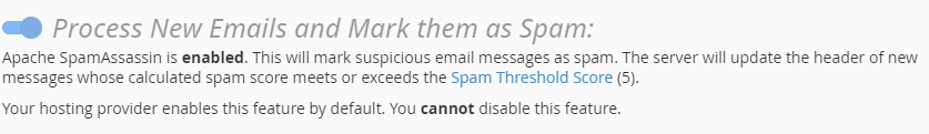 3. De click en Process New Emails and Mark them as Spam para habilitarlo. Si la perilla / palanca se muestra en color gris, significa que Apache SpamAssassin está deshabilitado y debe habilitarlo.